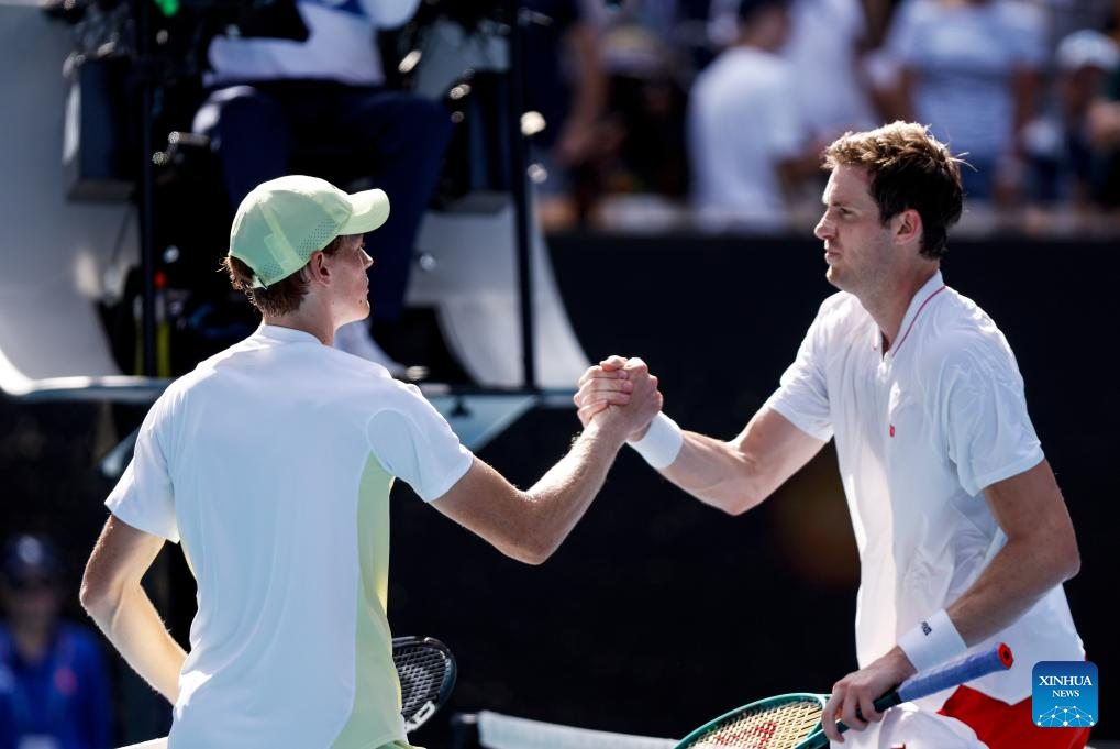 Jannik Sinner (L) shakes hand with Nicolas Jarry after the men's singles first round match between Jannik Sinner of Italy and Nicolas Jarry of Chile at Australian Open tennis tournament in Melbourne, Australia, Jan. 13, 2025. (Xinhua/Ma Ping)