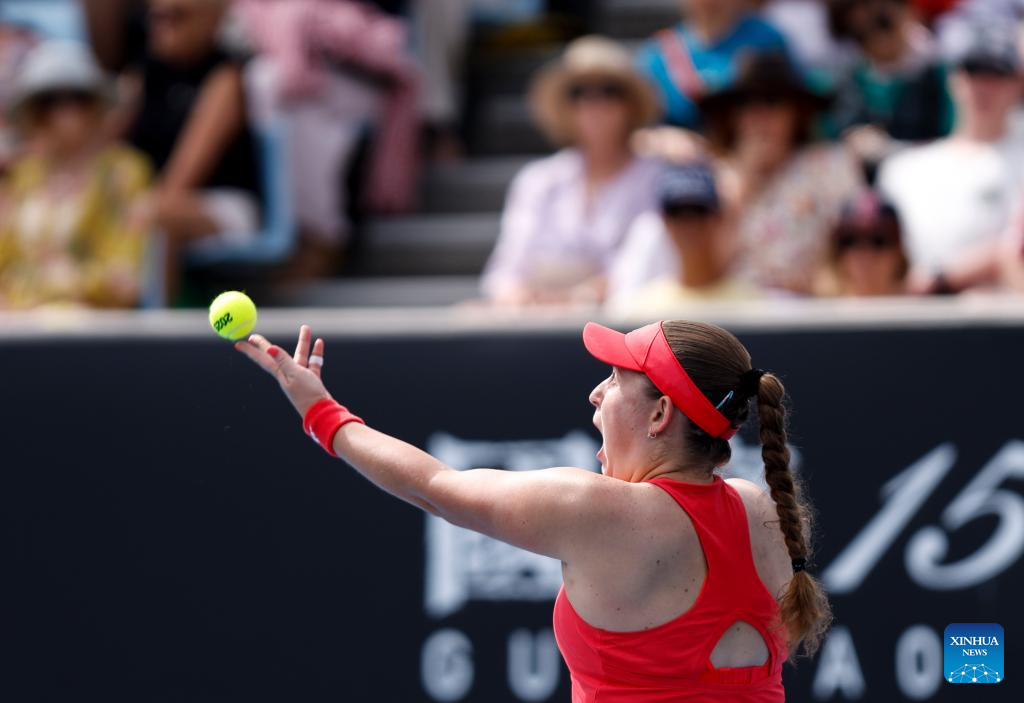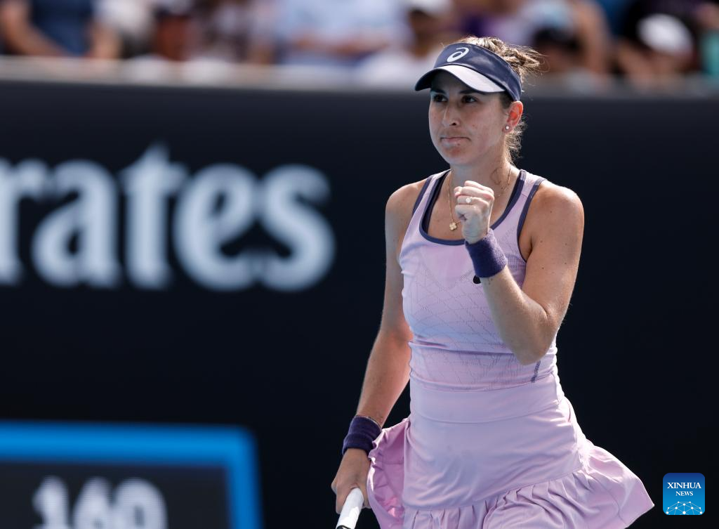 Belinda Bencic celebrates scoring during the women's singles first round match between Belinda Bencic of Switzerland and Jelena Ostapenko of Latvia at Australian Open tennis tournament in Melbourne, Australia, Jan. 13, 2025. (Xinhua/Ma Ping)