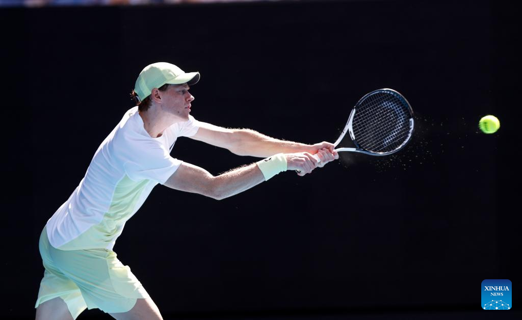 Jannik Sinner hits a return during the men's singles first round match between Jannik Sinner of Italy and Nicolas Jarry of Chile at Australian Open tennis tournament in Melbourne, Australia, Jan. 13, 2025. (Xinhua/Ma Ping)