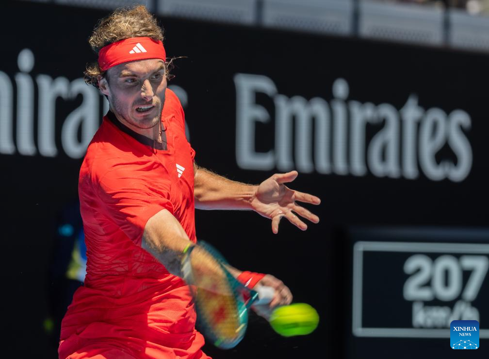 Stefanos Tsitsipas hits a return during the men's singles first round match between Stefanos Tsitsipas of Greece and Alex Michelsen of the United States at Australian Open tennis tournament in Melbourne, Australia, Jan. 13, 2025. (Photo by Hu Jingchen/Xinhua)