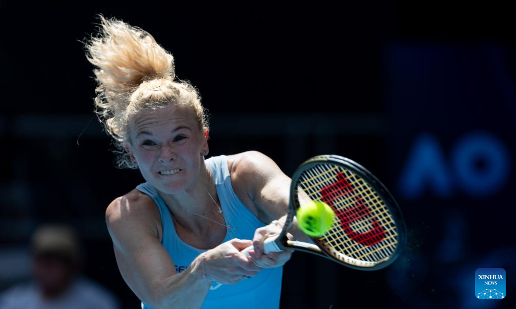 Katerina Siniakova hits a return during the women's singles first round match between Iga Swiatek of Poland and Katerina Siniakova of the Czech Republic at Australian Open tennis tournament in Melbourne, Australia, Jan. 13, 2025. (Photo by Hu Jingchen/Xinhua)