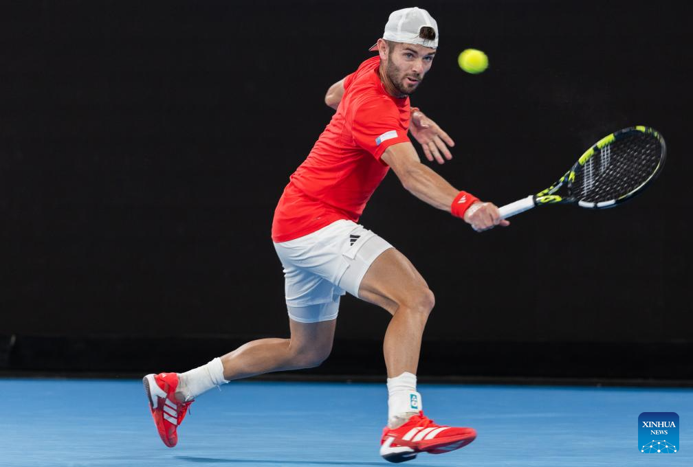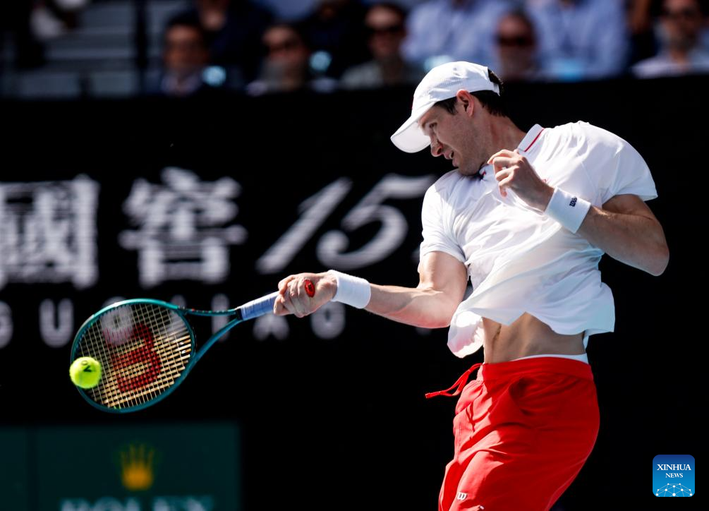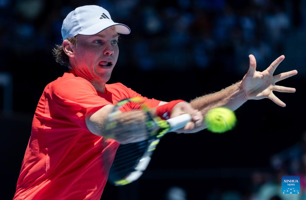 Jacob Fearnley hits a return during the men's singles first round match between Nick Kyrgios of Australia and Jacob Fearnley of Britain at Australian Open tennis tournament in Melbourne, Australia, Jan. 13, 2025. (Photo by Hu Jingchen/Xinhua)