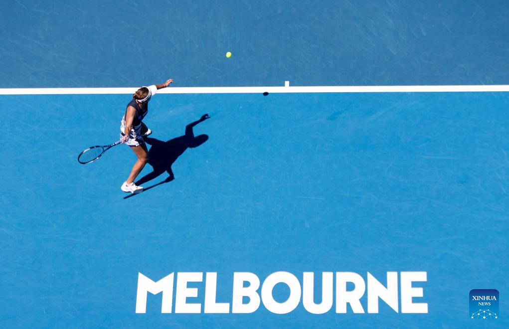 Anastasia Pavlyuchenkova hits a return during the women's singles first round match between Yuan Yue of China and Anastasia Pavlyuchenkova of Russia at Australian Open tennis tournament in Melbourne, Australia, Jan. 13, 2025. (Xinhua/Ma Ping)