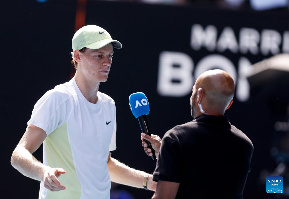 Jannik Sinner receives an interview after the men's singles first round match between Jannik Sinner of Italy and Nicolas Jarry of Chile at Australian Open tennis tournament in Melbourne, Australia, Jan. 13, 2025. (Xinhua/Ma Ping)