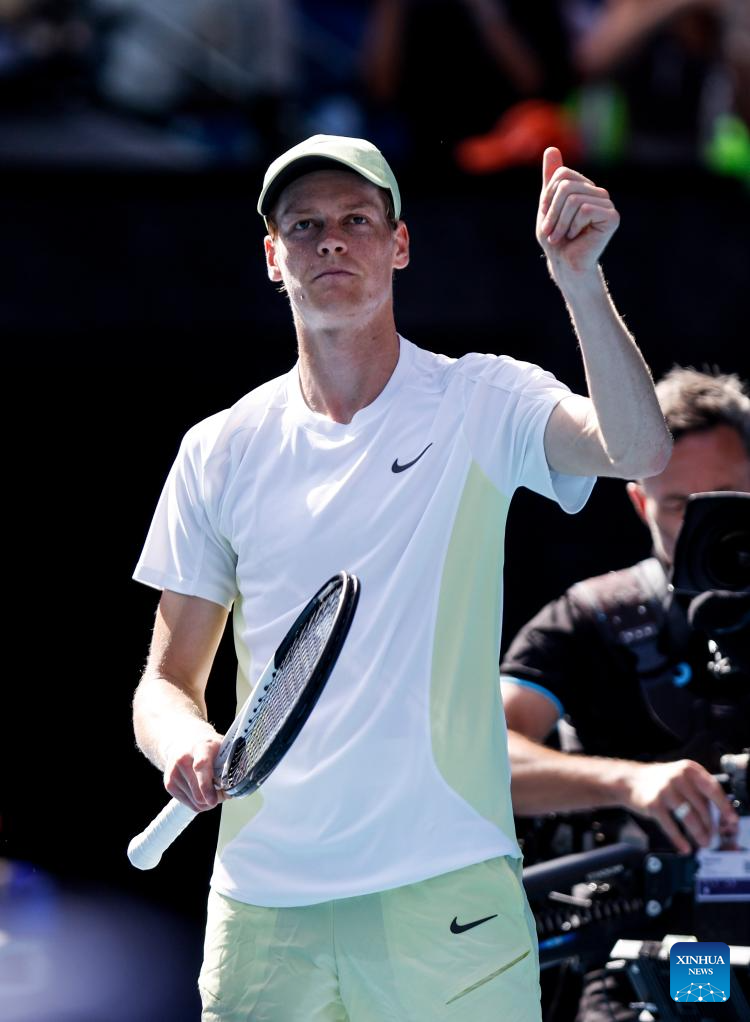 Jannik Sinner celebrates winning the men's singles first round match between Jannik Sinner of Italy and Nicolas Jarry of Chile at Australian Open tennis tournament in Melbourne, Australia, Jan. 13, 2025. (Xinhua/Ma Ping)