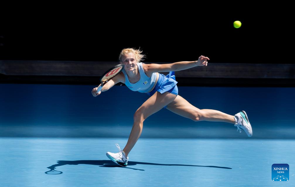 Maya Joint hits a return during the women's singles first round match between Jessica Pegula of the United States and Maya Joint of Australia at Australian Open tennis tournament in Melbourne, Australia, Jan. 13, 2025. (Photo by Hu Jingchen/Xinhua)