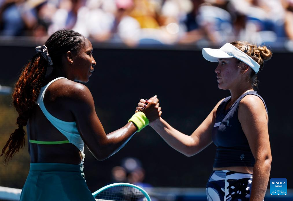 Coco Gauff (L) shakes hand with Sofia Kenin after the women's singles first round match between Coco Gauff and Sofia Kenin of the United States at Australian Open tennis tournament in Melbourne, Australia, Jan. 13, 2025. (Xinhua/Ma Ping)