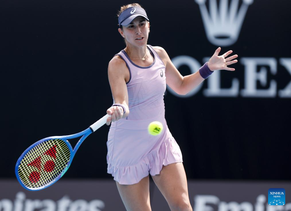 Belinda Bencic hits a return during the women's singles first round match between Belinda Bencic of Switzerland and Jelena Ostapenko of Latvia at Australian Open tennis tournament in Melbourne, Australia, Jan. 13, 2025. (Xinhua/Ma Ping)