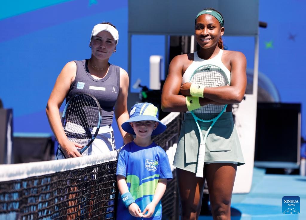 Coco Gauff (R) and Sofia Kenin (L) pose for a photo before the women's singles first round match between Coco Gauff and Sofia Kenin of the United States at Australian Open tennis tournament in Melbourne, Australia, Jan. 13, 2025. (Xinhua/Ma Ping)