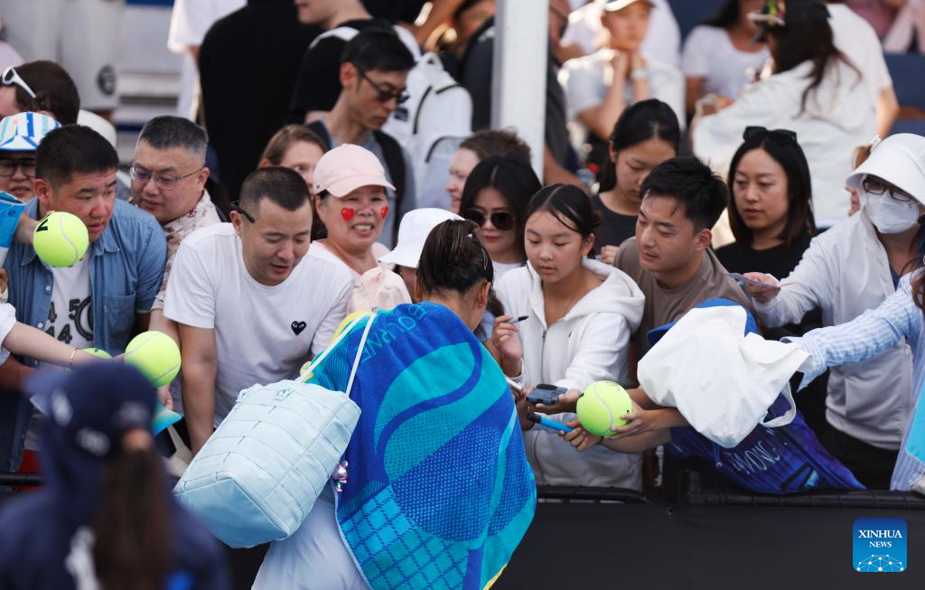 Yuan Yue signs autographs for spectators after the women's singles first round match between Yuan Yue of China and Anastasia Pavlyuchenkova of Russia at Australian Open tennis tournament in Melbourne, Australia, Jan. 13, 2025. (Xinhua/Ma Ping)