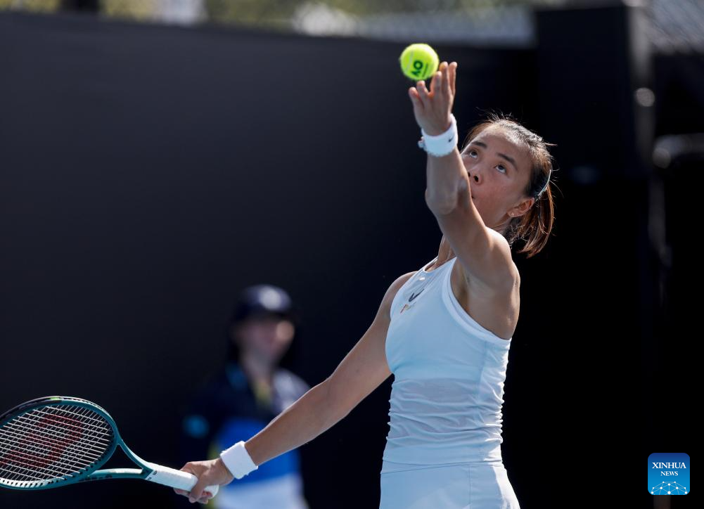 Yuan Yue serves during the women's singles first round match between Yuan Yue of China and Anastasia Pavlyuchenkova of Russia at Australian Open tennis tournament in Melbourne, Australia, Jan. 13, 2025. (Xinhua/Ma Ping)