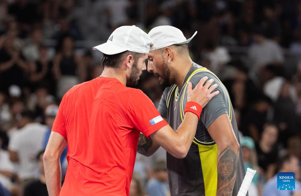 Nick Kyrgios (R) greets Jacob Fearnley after the men's singles first round match between Nick Kyrgios of Australia and Jacob Fearnley of Britain at Australian Open tennis tournament in Melbourne, Australia, Jan. 13, 2025. (Photo by Hu Jingchen/Xinhua)