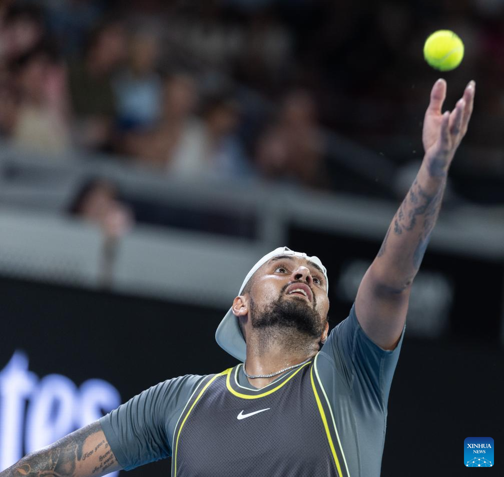 Nick Kyrgios serves during the men's singles first round match between Nick Kyrgios of Australia and Jacob Fearnley of Britain at Australian Open tennis tournament in Melbourne, Australia, Jan. 13, 2025. (Photo by Hu Jingchen/Xinhua)