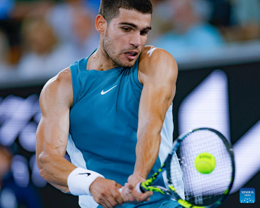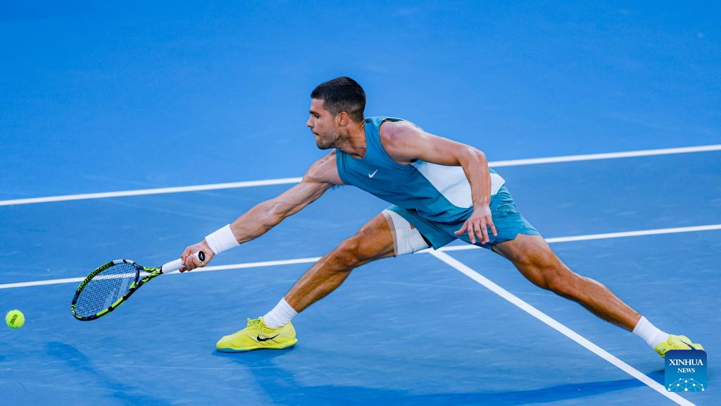 Carlos Alcaraz hits a return during the men's singles first round match between Carlos Alcaraz of Spain and Alexander Shevchenko of Kazakhstan at Australian Open tennis tournament in Melbourne, Australia, Jan. 13, 2025. (Photo by Chu Chen/Xinhua)