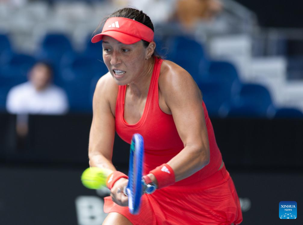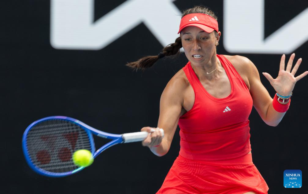 Jessica Pegula hits a return during the women's singles first round match between Jessica Pegula of the United States and Maya Joint of Australia at Australian Open tennis tournament in Melbourne, Australia, Jan. 13, 2025. (Photo by Hu Jingchen/Xinhua)