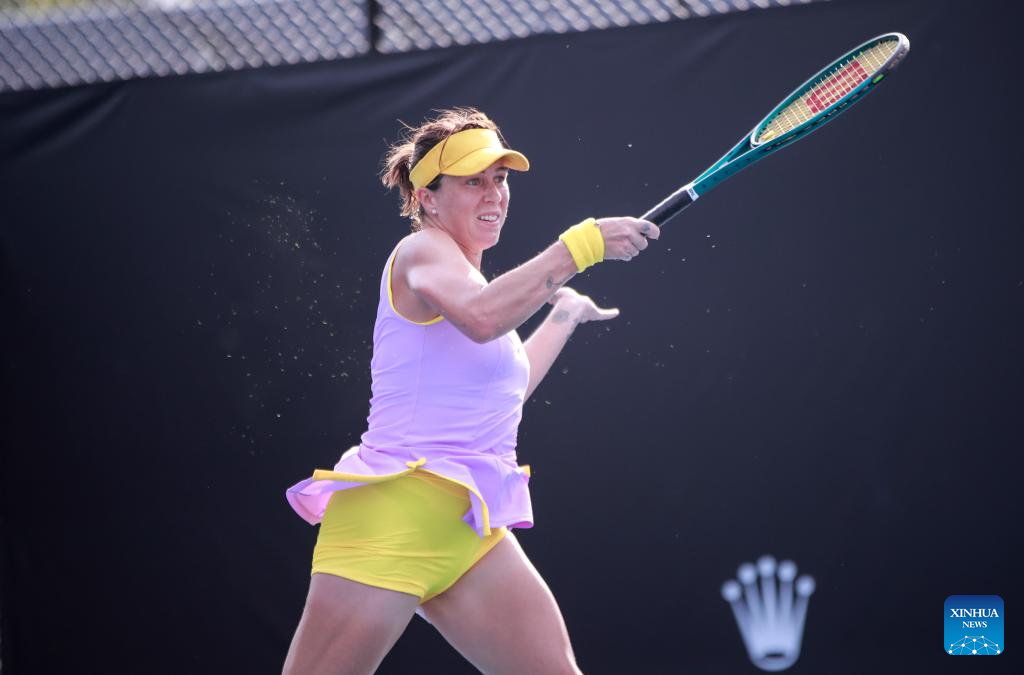 Sofia Kenin hits a return during the women's singles first round match between Coco Gauff and Sofia Kenin of the United States at Australian Open tennis tournament in Melbourne, Australia, Jan. 13, 2025. (Xinhua/Ma Ping)
