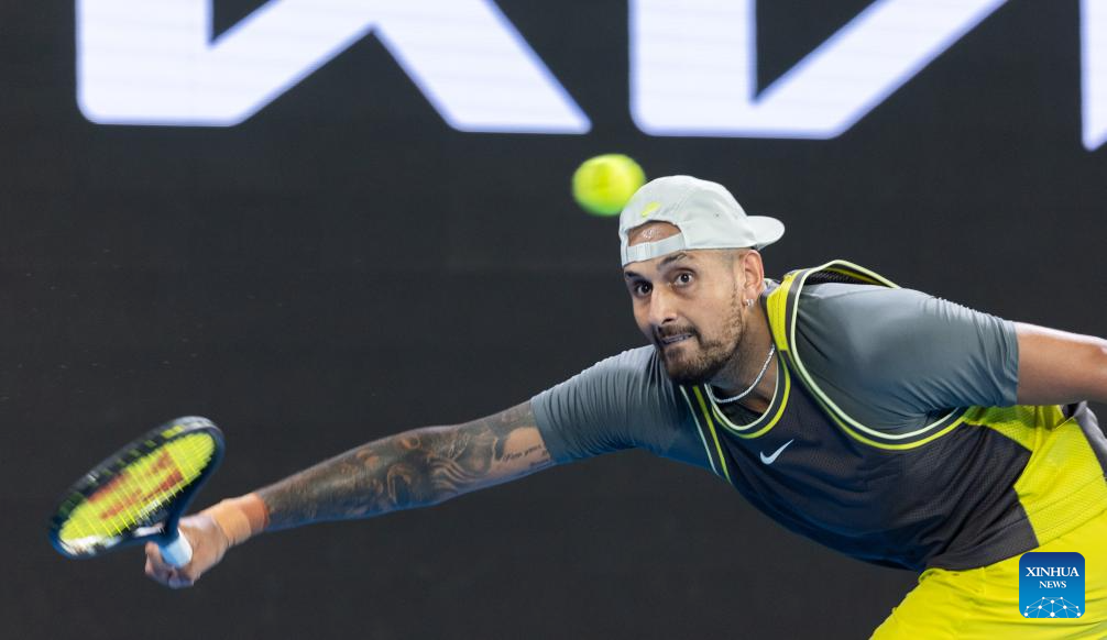 Nick Kyrgios hits a return during the men's singles first round match between Nick Kyrgios of Australia and Jacob Fearnley of Britain at Australian Open tennis tournament in Melbourne, Australia, Jan. 13, 2025. (Photo by Hu Jingchen/Xinhua)