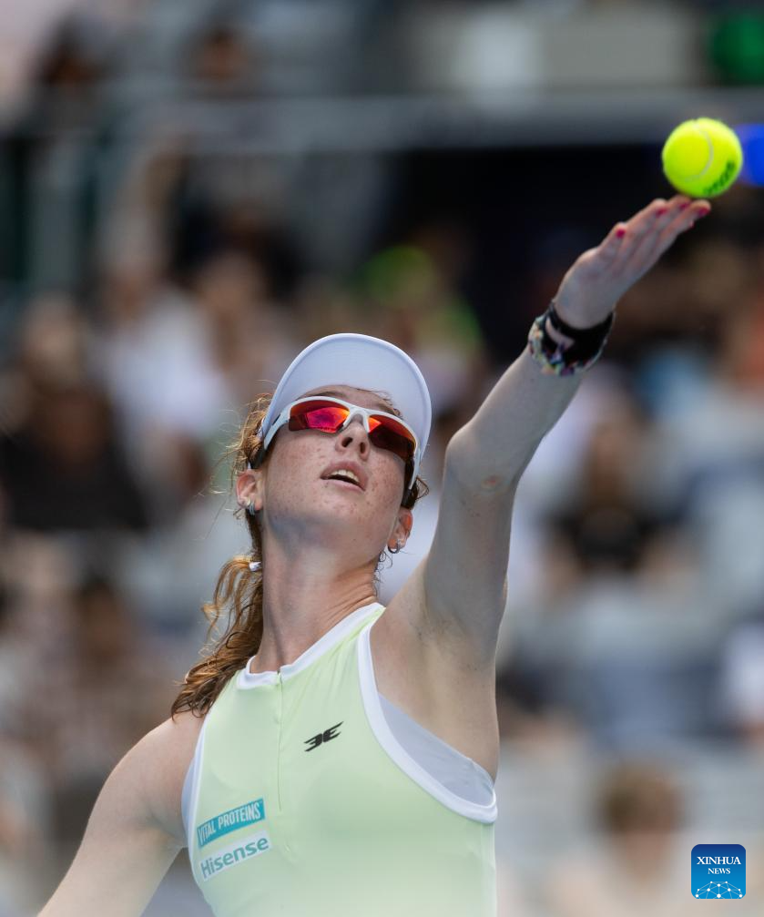 Maya Joint serves during the women's singles first round match between Jessica Pegula of the United States and Maya Joint of Australia at Australian Open tennis tournament in Melbourne, Australia, Jan. 13, 2025. (Photo by Hu Jingchen/Xinhua)