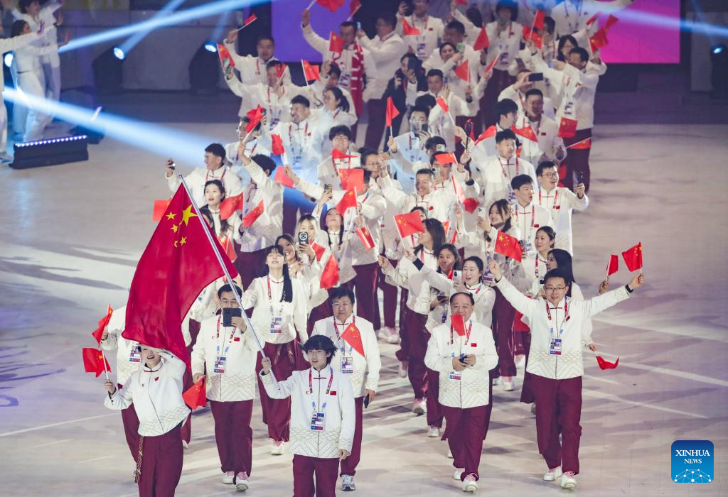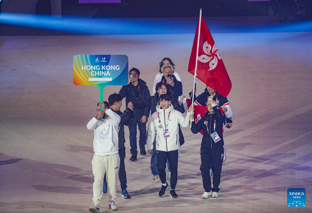 Members of the delegation of China's Hong Kong arrive for the opening ceremony of the 2025 FISU Winter World University Games in Turin, Italy, Jan. 13, 2025. (Xinhua/Zhang Fan)