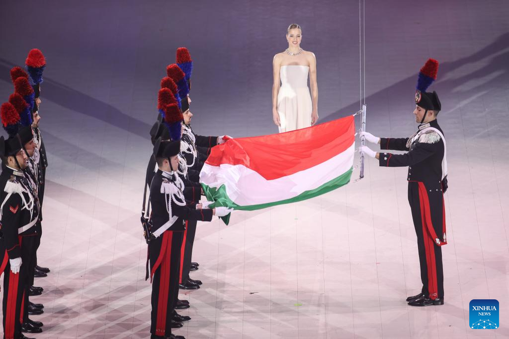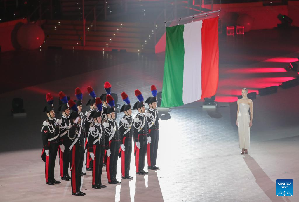 The national flag of Italy is seen during the opening ceremony of the 2025 FISU Winter World University Games in Turin, Italy, Jan. 13, 2025. (Xinhua/Li Jing)