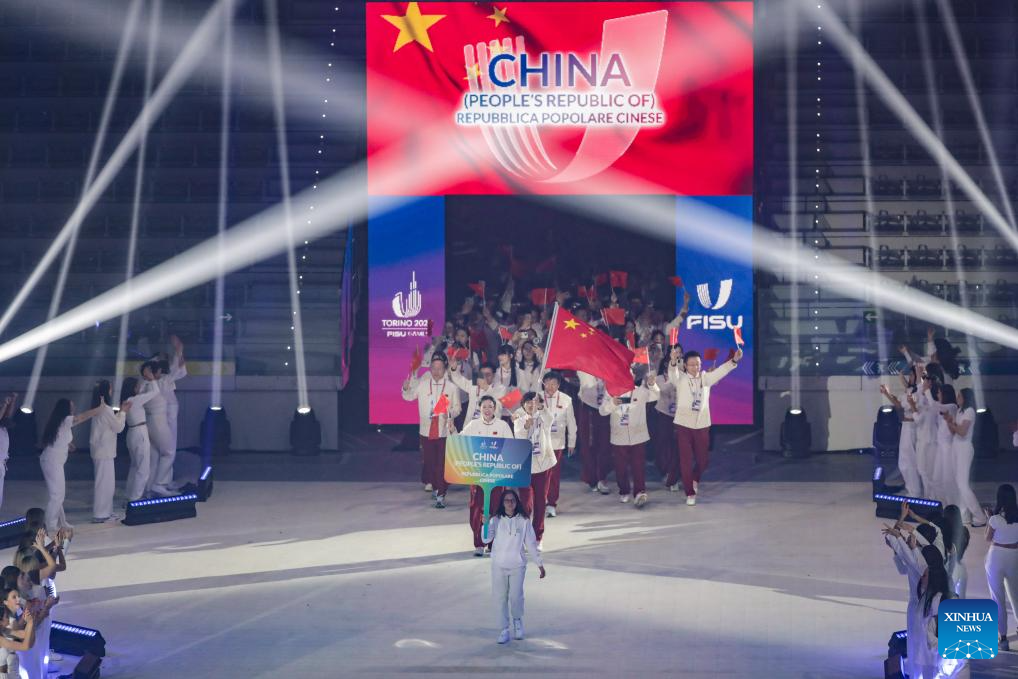 Members of Chinese delegation arrive for the opening ceremony of the 2025 FISU Winter World University Games in Turin, Italy, Jan. 13, 2025. (Xinhua/Zhang Fan)