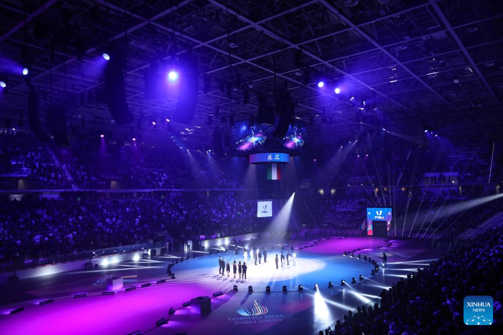 The FISU flag is seen during the opening ceremony of the 2025 FISU Winter World University Games in Turin, Italy, Jan. 13, 2025. (Xinhua/Li Jing)