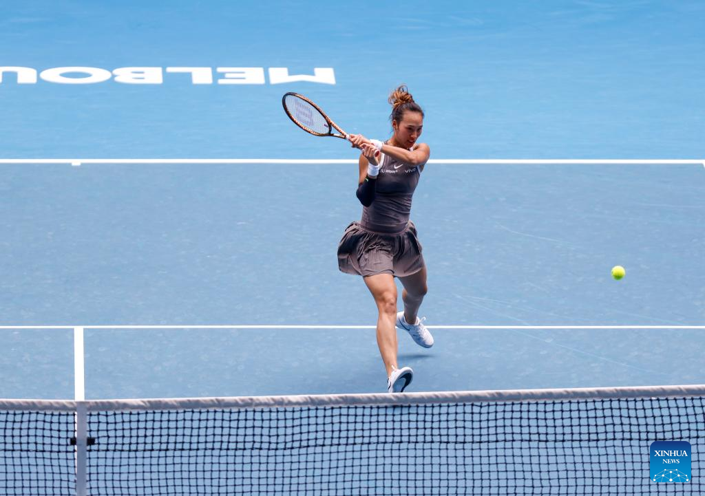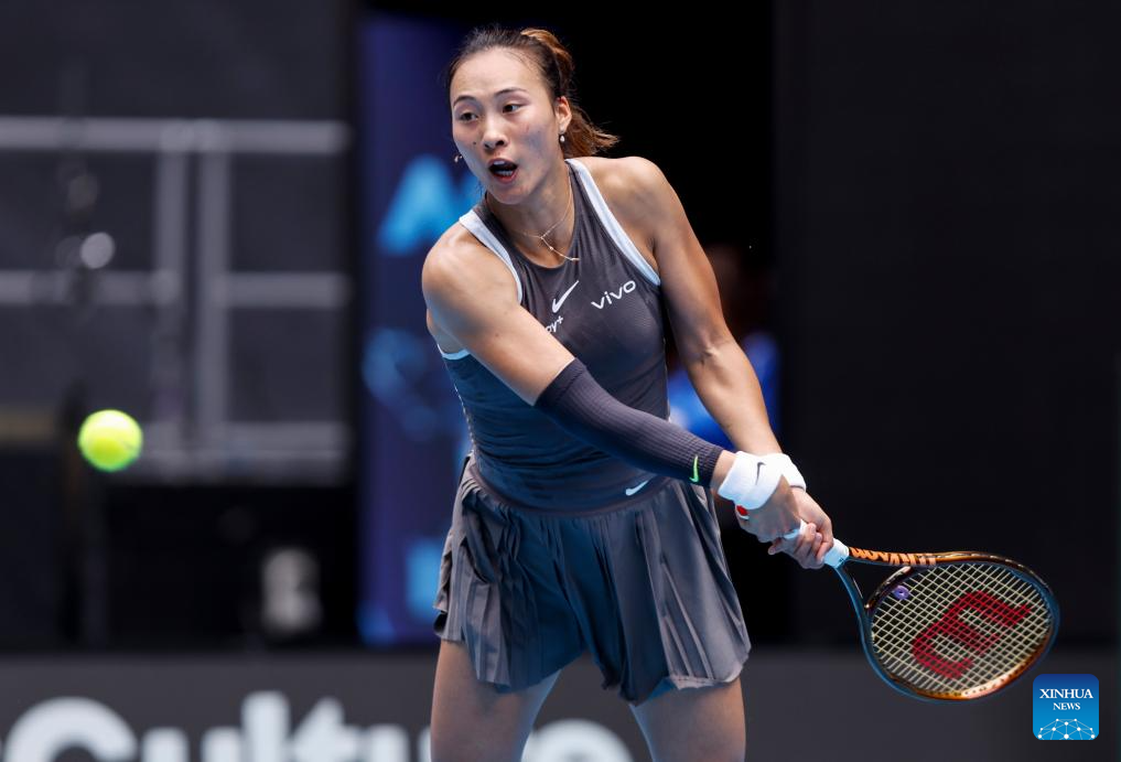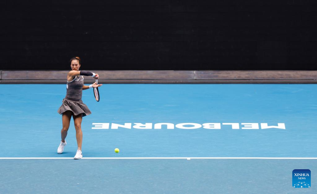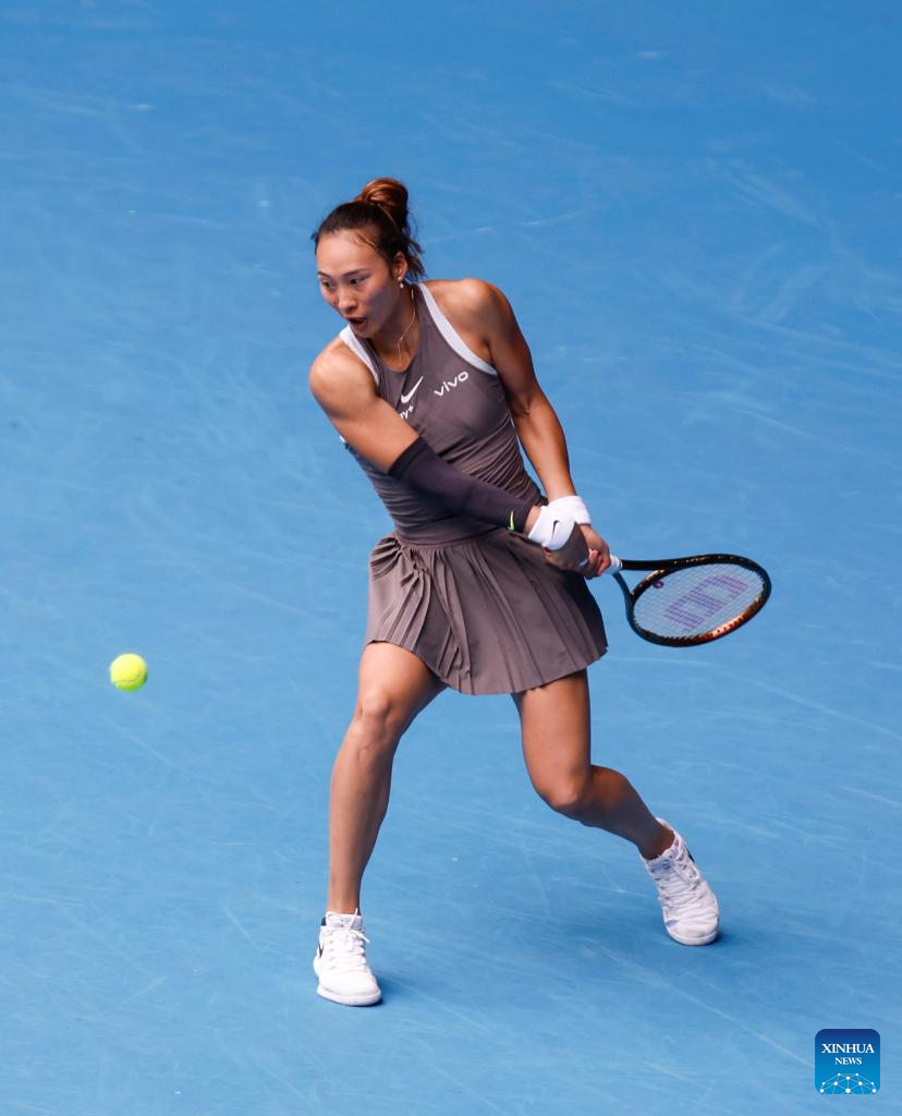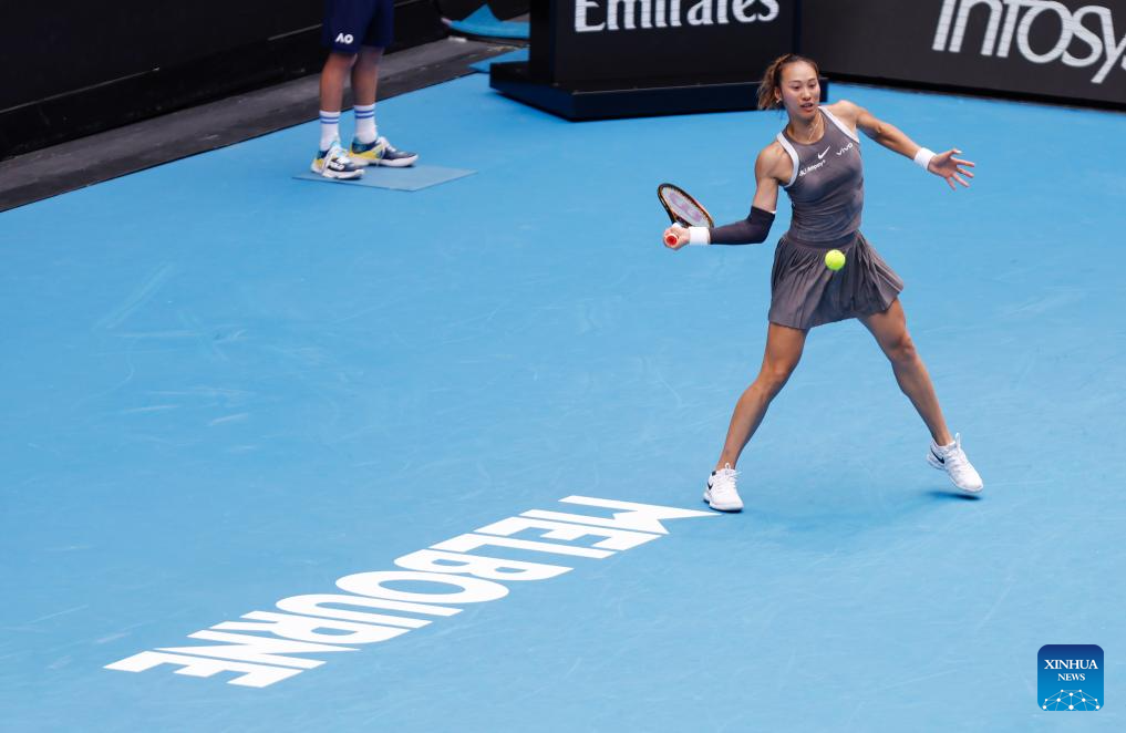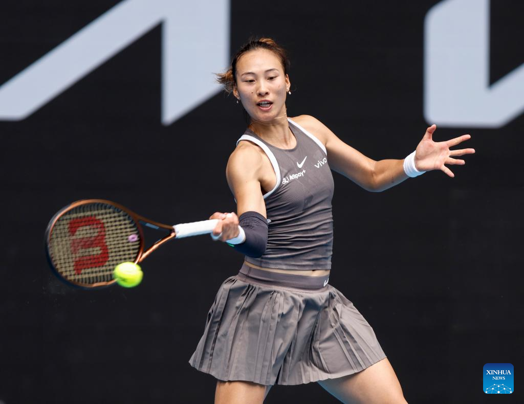Zheng Qinwen hits a return during the women's singles 2nd round match between Zheng Qinwen of China and Laura Siegemund of Germany at Australian Open tennis tournament in Melbourne, Australia, Jan. 15, 2025. (Xinhua/Ma Ping)