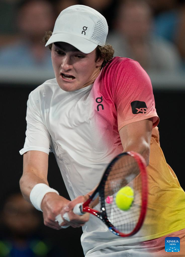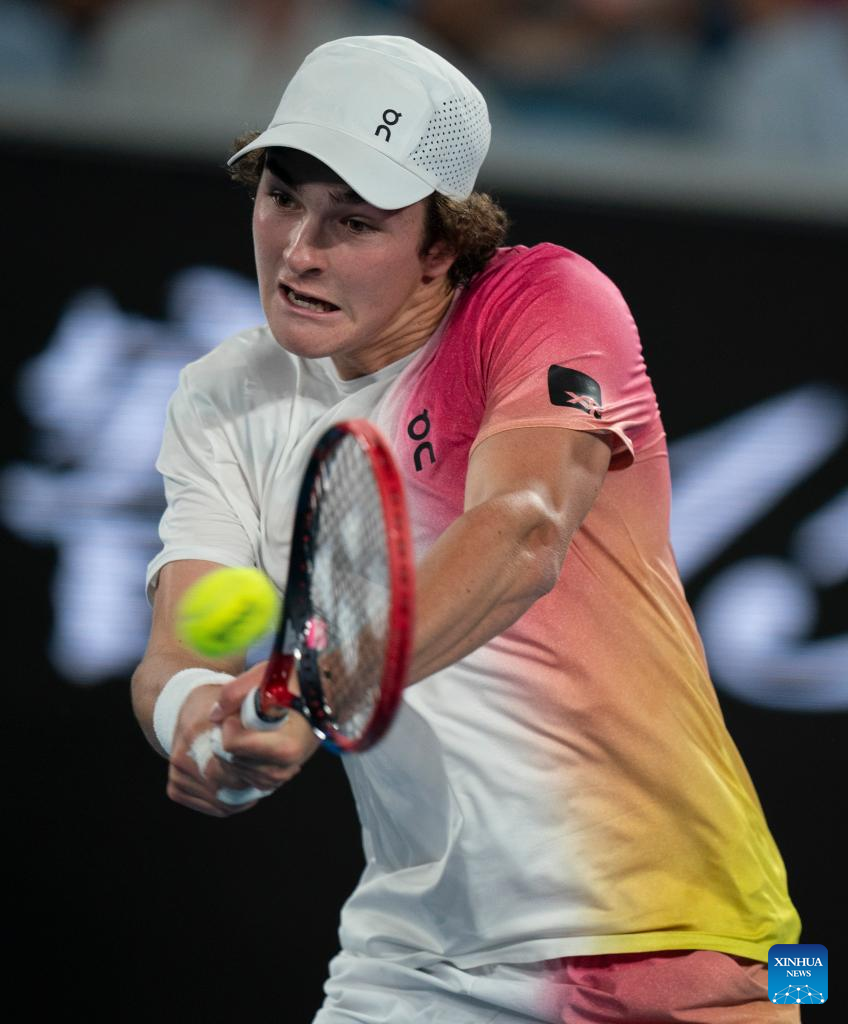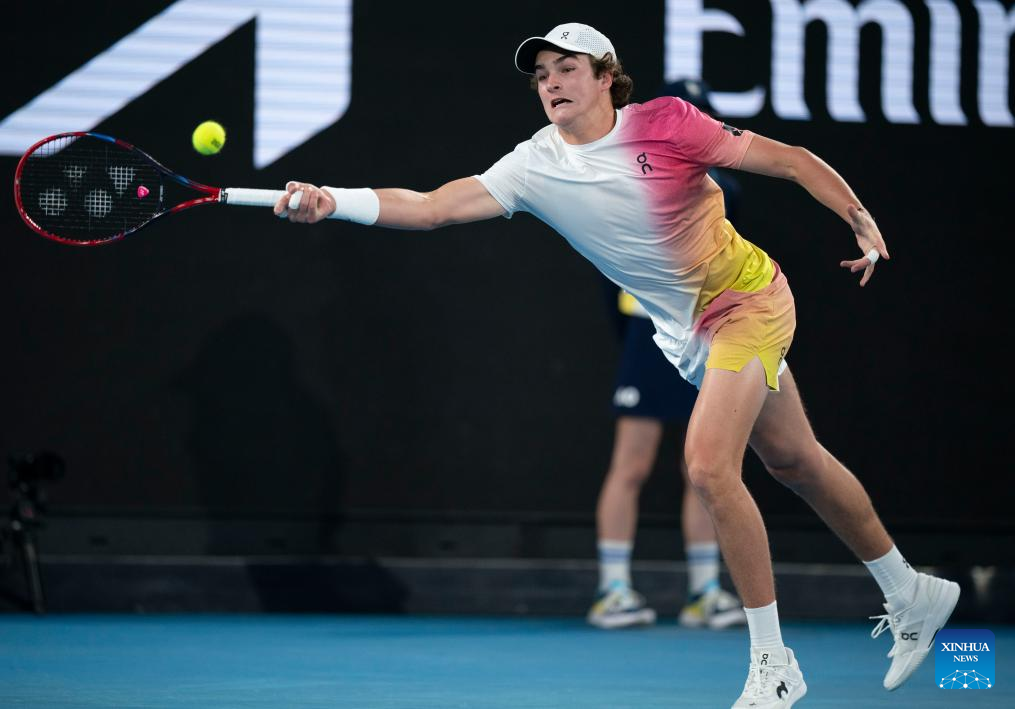 Joao Fonseca hits a return during the men's singles first round match between Joao Fonseca of Brazil and Andrey Rublev of Russia at Australian Open tennis tournament in Melbourne, Australia, Jan. 14, 2025. (Xinhua/Lui Siu Wai)