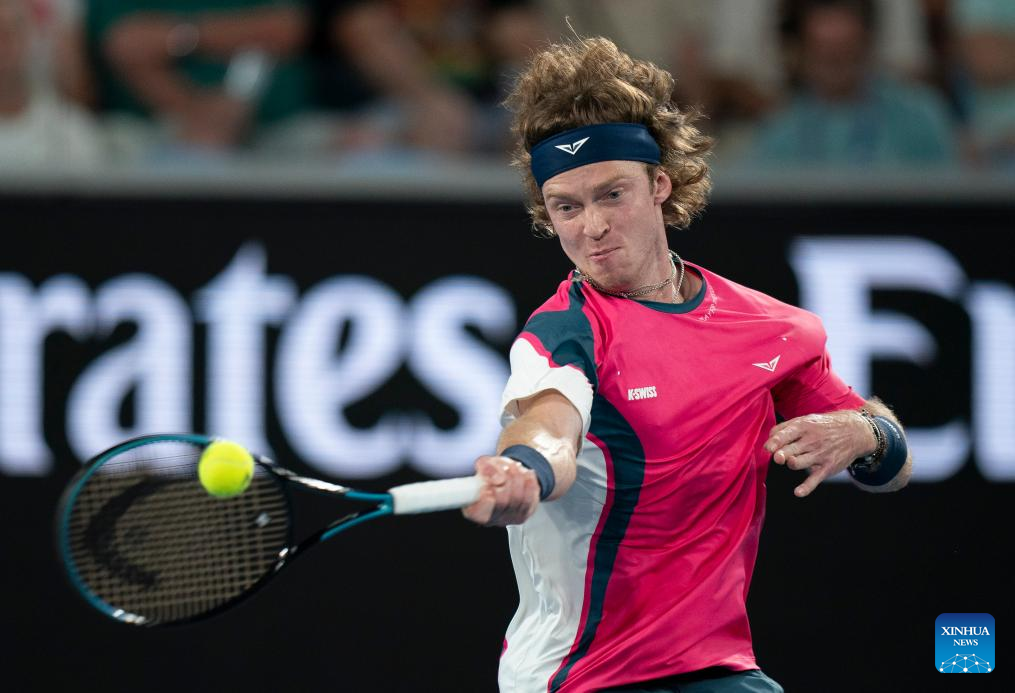 Andrey Rublev hits a return during the men's singles first round match between Joao Fonseca of Brazil and Andrey Rublev of Russia at Australian Open tennis tournament in Melbourne, Australia, Jan. 14, 2025. (Xinhua/Lui Siu Wai)