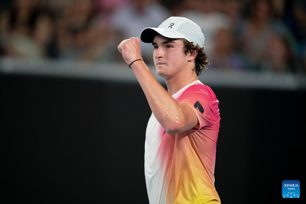 Joao Fonseca celebrates during the men's singles first round match between Joao Fonseca of Brazil and Andrey Rublev of Russia at Australian Open tennis tournament in Melbourne, Australia, Jan. 14, 2025. (Xinhua/Lui Siu Wai)
