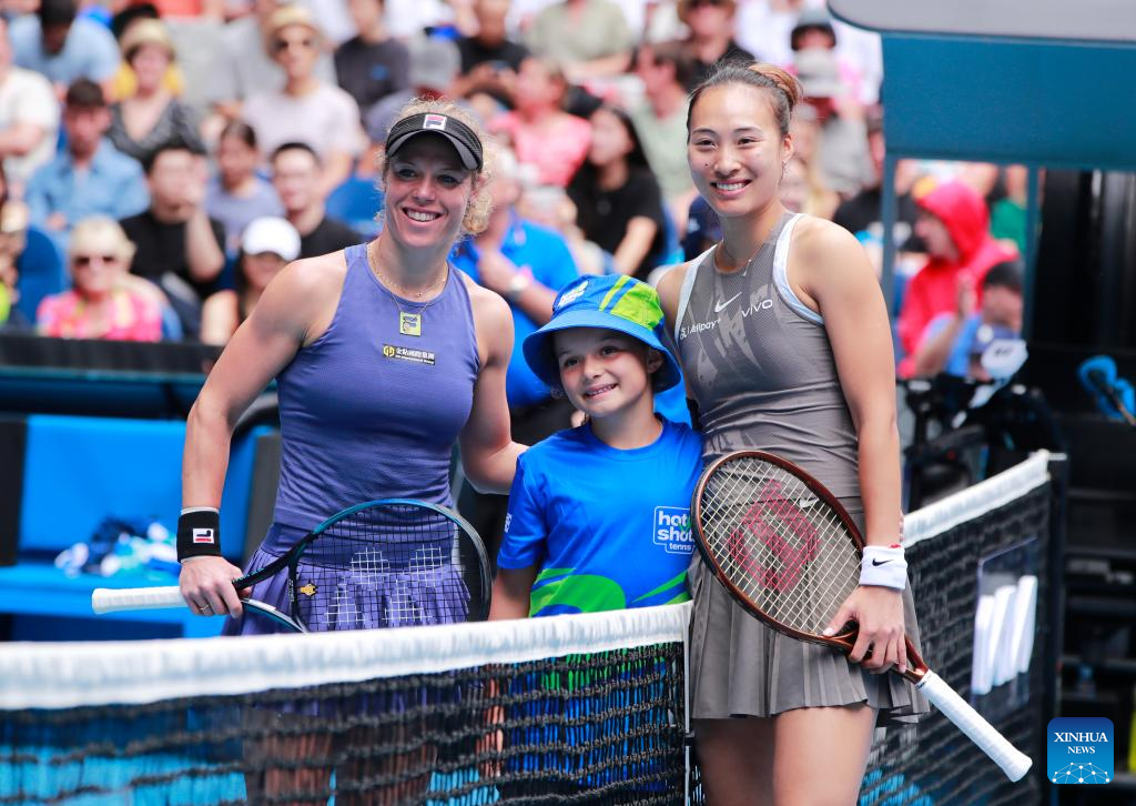 Zheng Qinwen (R) and Laura Siegemund (L) pose with a ballboy before the women's singles 2nd round match between Zheng Qinwen of China and Laura Siegemund of Germany at Australian Open tennis tournament in Melbourne, Australia, Jan. 15, 2025. (Xinhua/Ma Ping)