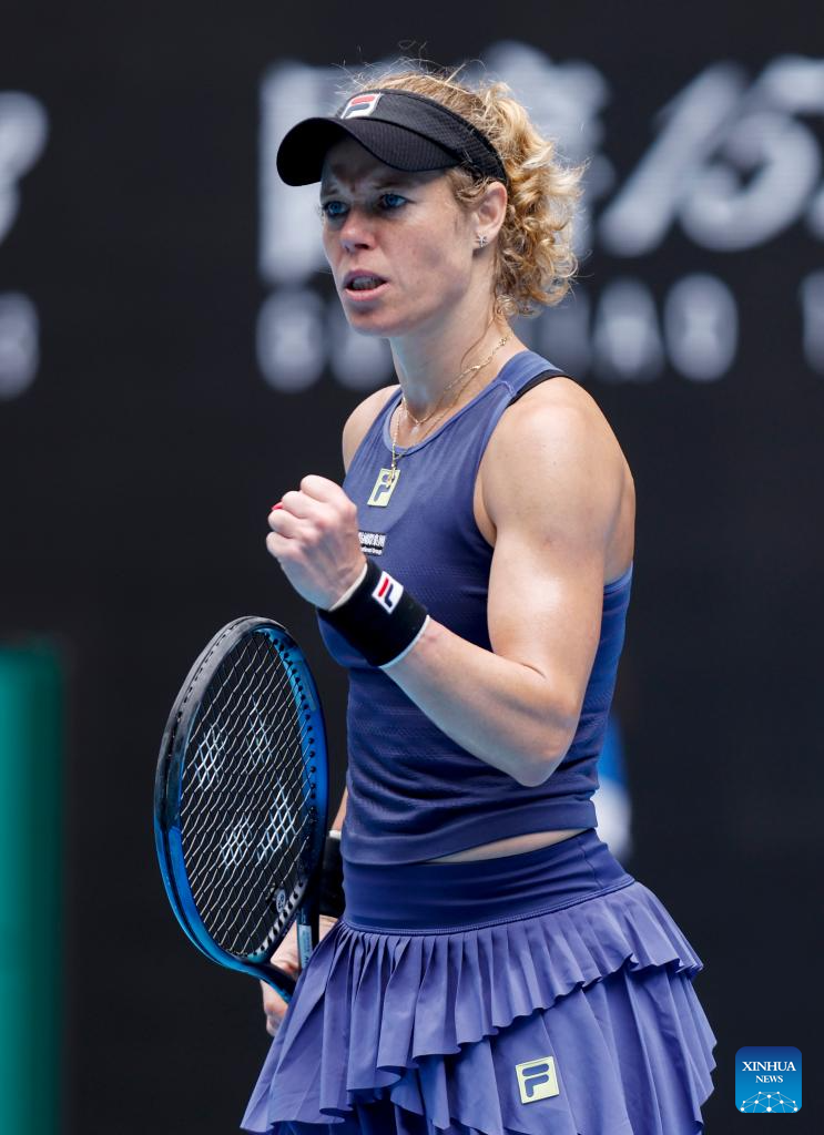 Laura Siegemund reacts during the women's singles 2nd round match between Zheng Qinwen of China and Laura Siegemund of Germany at Australian Open tennis tournament in Melbourne, Australia, Jan. 15, 2025. (Xinhua/Ma Ping)