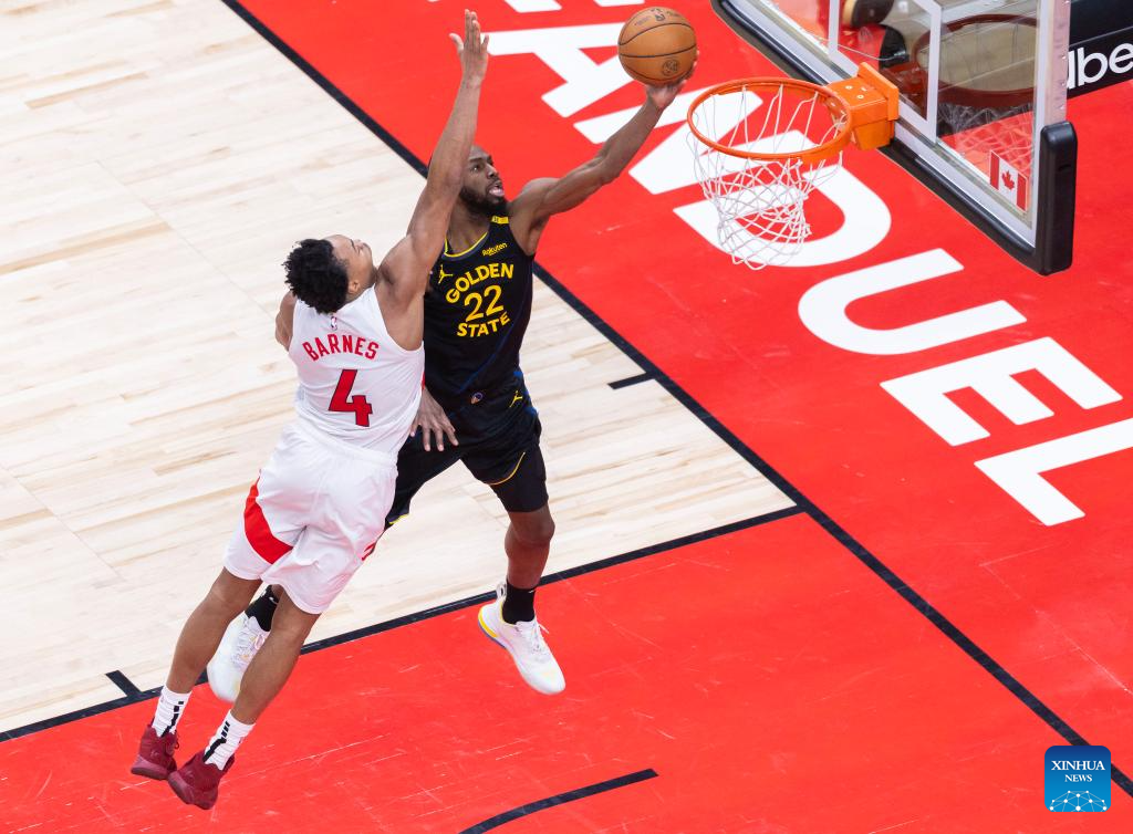 Andrew Wiggins (R) of Golden State Warriors goes up for a layup during the 2024-2025 NBA regular season game between Toronto Raptors and Golden State Warriors in Toronto, Canada, Jan. 13, 2025. (Xinhua/Zou Zheng)