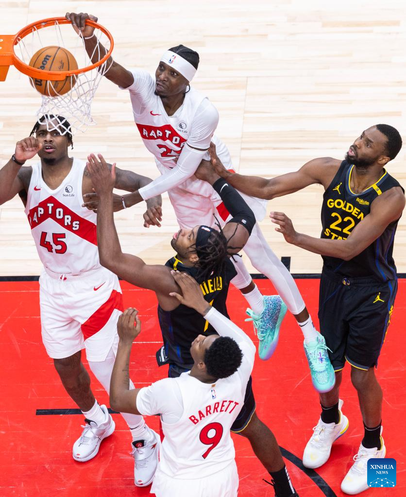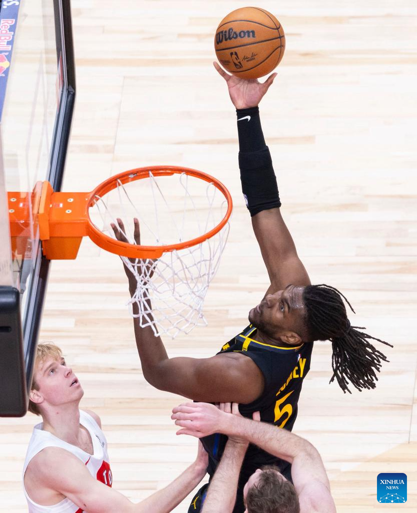 Kevon Looney (R) of Golden State Warriors makes a layup during the 2024-2025 NBA regular season game between Toronto Raptors and Golden State Warriors in Toronto, Canada, Jan. 13, 2025. (Xinhua/Zou Zheng)
