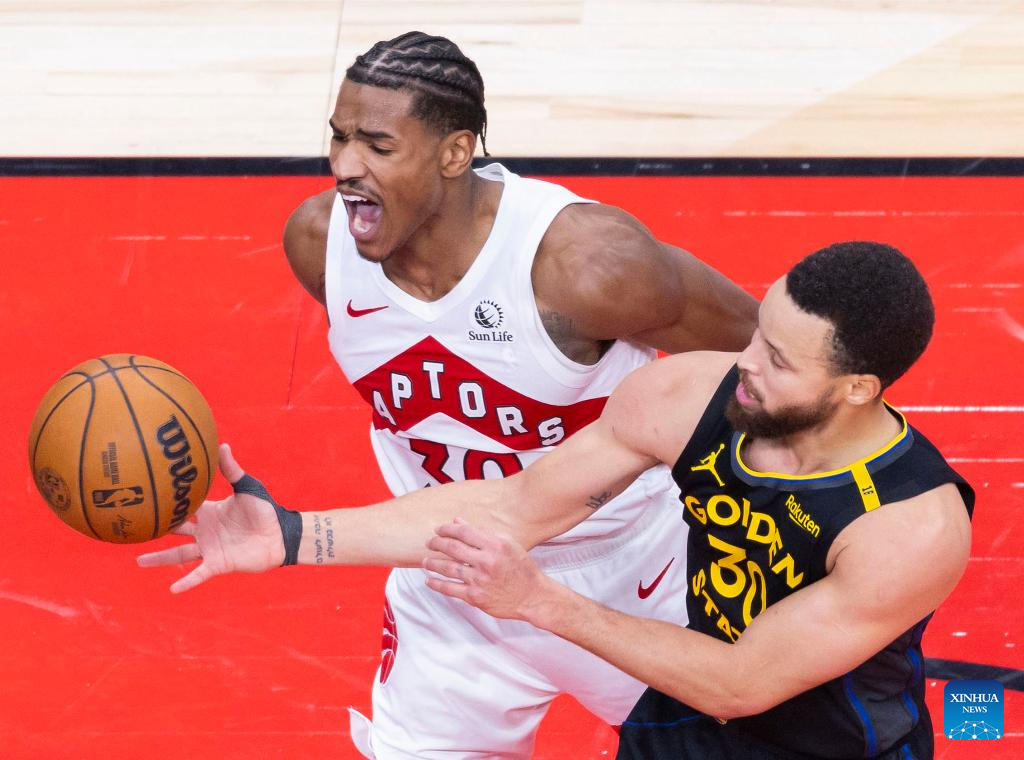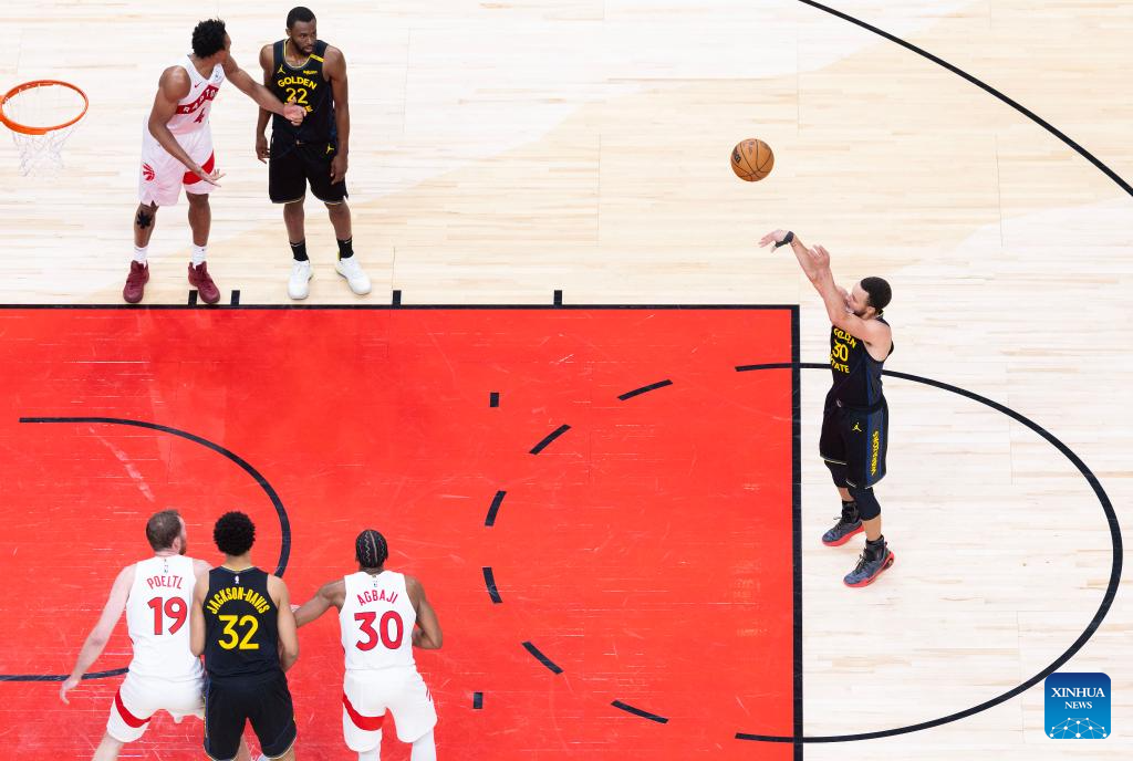 Stephen Curry (R) of Golden State Warriors makes a free throw during the 2024-2025 NBA regular season game between Toronto Raptors and Golden State Warriors in Toronto, Canada, Jan. 13, 2025. (Xinhua/Zou Zheng)