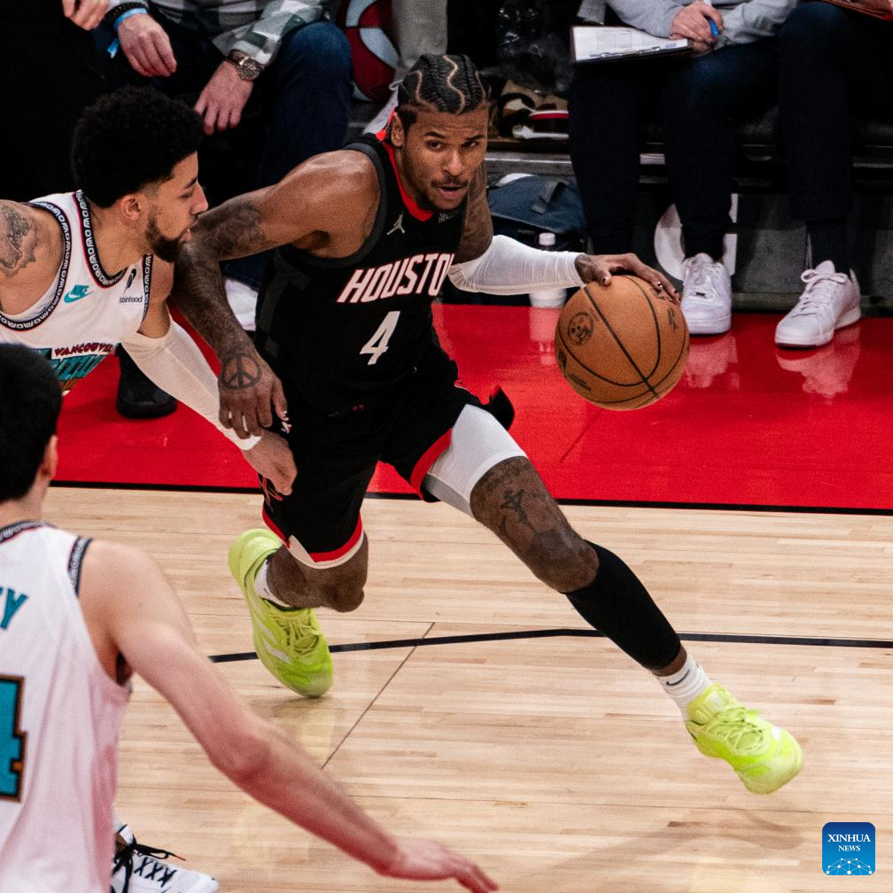 Jalen Green (R) of Houston Rockets dribbles during the 2024-2025 NBA regular season match between Houston Rockets and Memphis Grizzlies in Houston, Texas, the United States, Jan. 13, 2025. (Photo by Chen Chen/Xinhua)