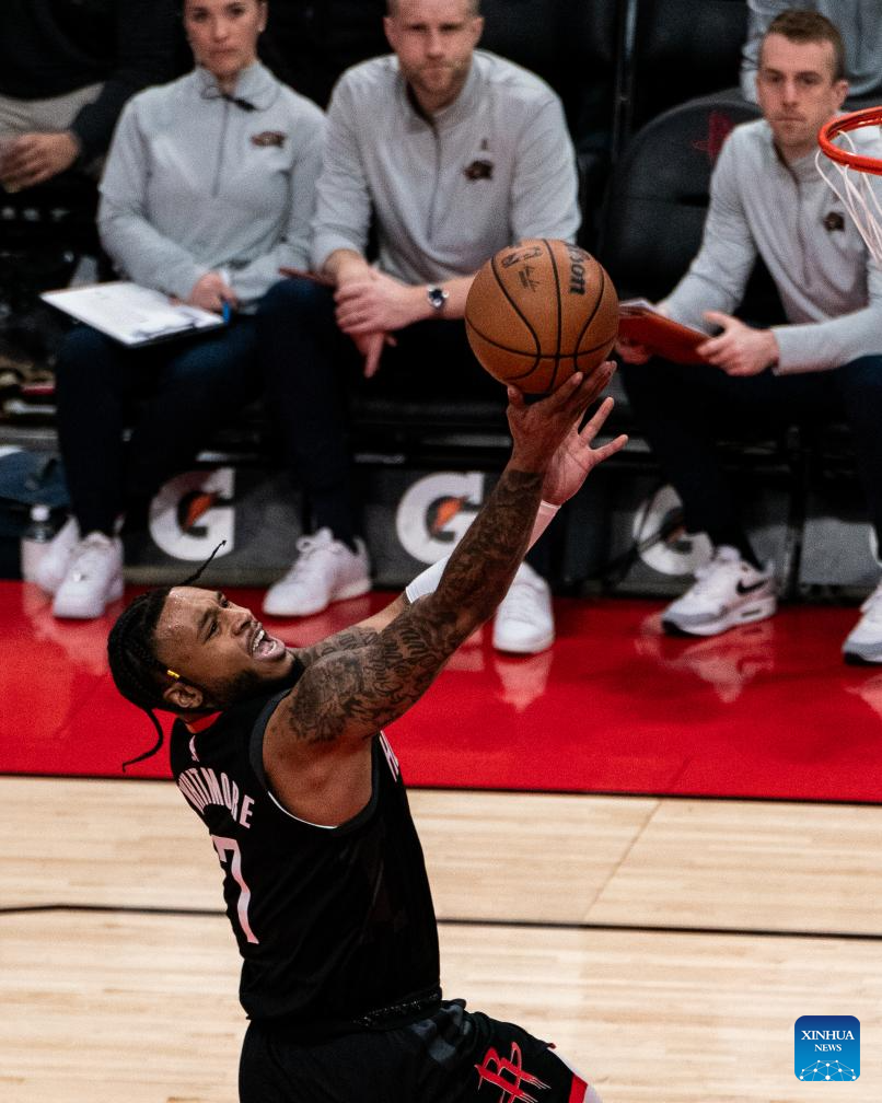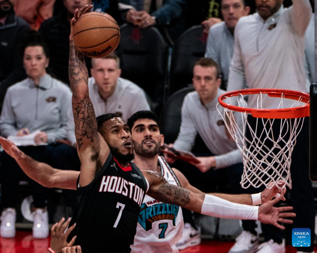 Cam Whitmore of Houston Rockets lays up the ball during the 2024-2025 NBA regular season match between Houston Rockets and Memphis Grizzlies in Houston, Texas, the United States, Jan. 13, 2025. (Photo by Chen Chen/Xinhua)