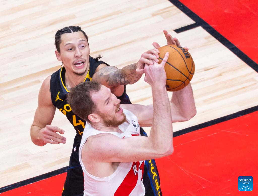 Lindy Waters III (back) of Golden State Warriors fights for a rebound with Jakob Poeltl of Toronto Raptors during the 2024-2025 NBA regular season game in Toronto, Canada, Jan. 13, 2025. (Xinhua/Zou Zheng)