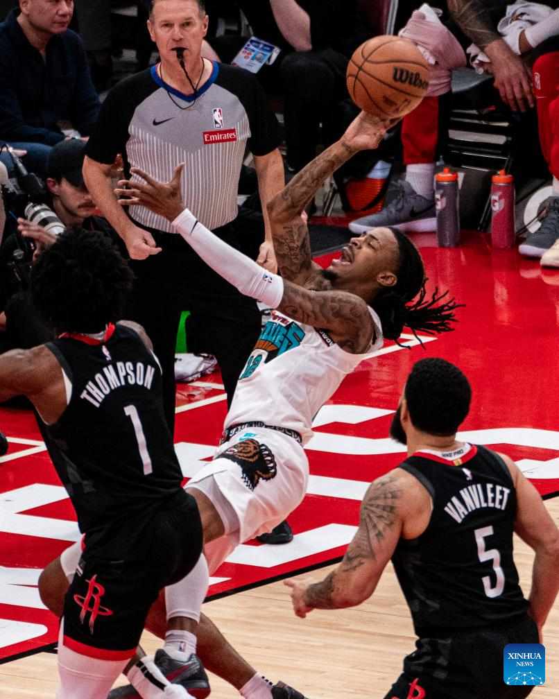 Ja Morant (C) of Memphis Grizzlie shoots the ball during the 2024-2025 NBA regular season match between Houston Rockets and Memphis Grizzlies in Houston, Texas, the United States, Jan. 13, 2025. (Photo by Chen Chen/Xinhua)