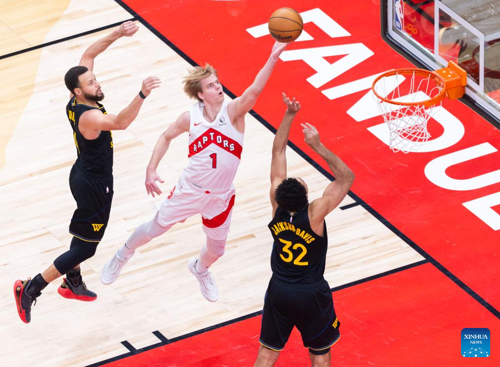 Gradey Dick (C) of Toronto Raptors goes up for a layup during the 2024-2025 NBA regular season game between Toronto Raptors and Golden State Warriors in Toronto, Canada, Jan. 13, 2025. (Xinhua/Zou Zheng)