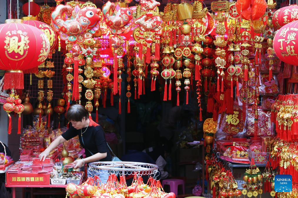 A resident buys Chinese New Year decorations at China Town in Bangkok, Thailand, Jan. 14, 2025. (Xinhua/Rachen Sageamsak)