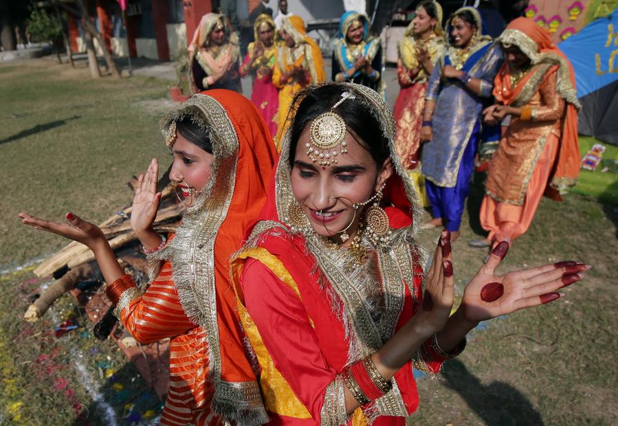 Indian college students wearing traditional Punjabi attire celebrate the Lohri festival in Amritsar district of India's northern Punjab state, Jan. 13, 2025. (Str/Xinhua)