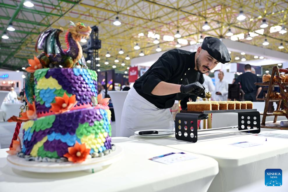 A cook prepares dessert during the HORECA Kuwait 2025 exhibition in Hawalli Governorate, Kuwait, Jan. 14, 2025.