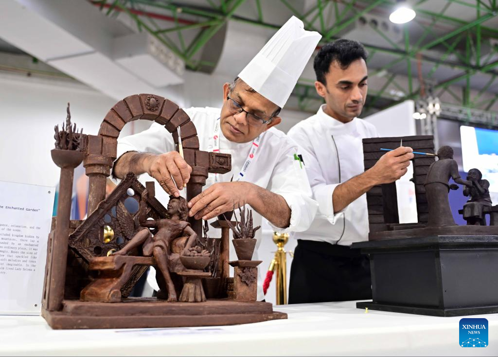 Cooks prepare dessert during the HORECA Kuwait 2025 exhibition in Hawalli Governorate, Kuwait, Jan. 14, 2025.
