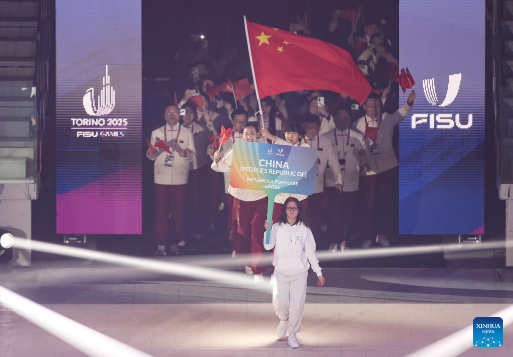 Members of Chinese delegation arrive for the opening ceremony of the 2025 FISU Winter World University Games in Turin, Italy, Jan. 13, 2025. (Xinhua/Li Jing)