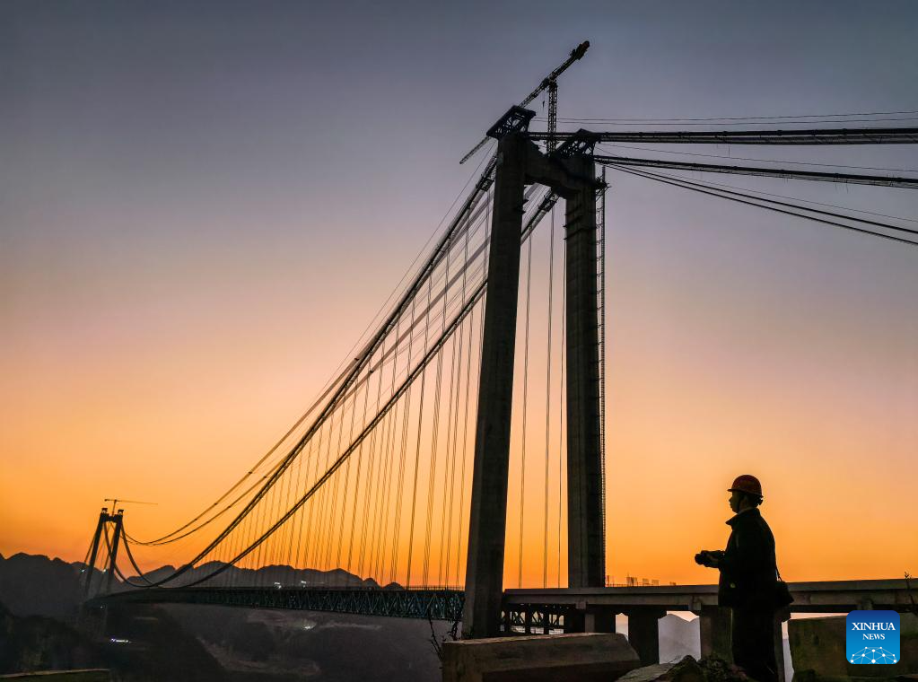 The construction of the 2,890-meter-long bridge started in 2022. With a designed height of 625 meters between the bridge deck and the Beipanjiang River below, the bridge is set to be the highest in the world after it is completed in 2025. (Xinhua/Yang Wenbin)
