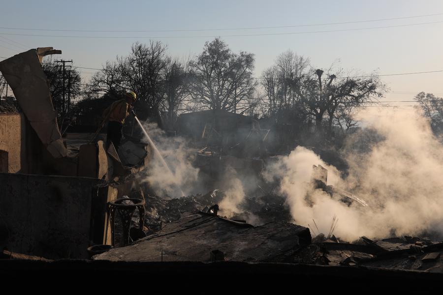 LOS ANGELES, Jan. 14 (Xinhua) -- Firefighters continued to work overnight to contain wildfires in greater Los Angeles, with "particularly dangerous" winds warning in effect through Wednesday.