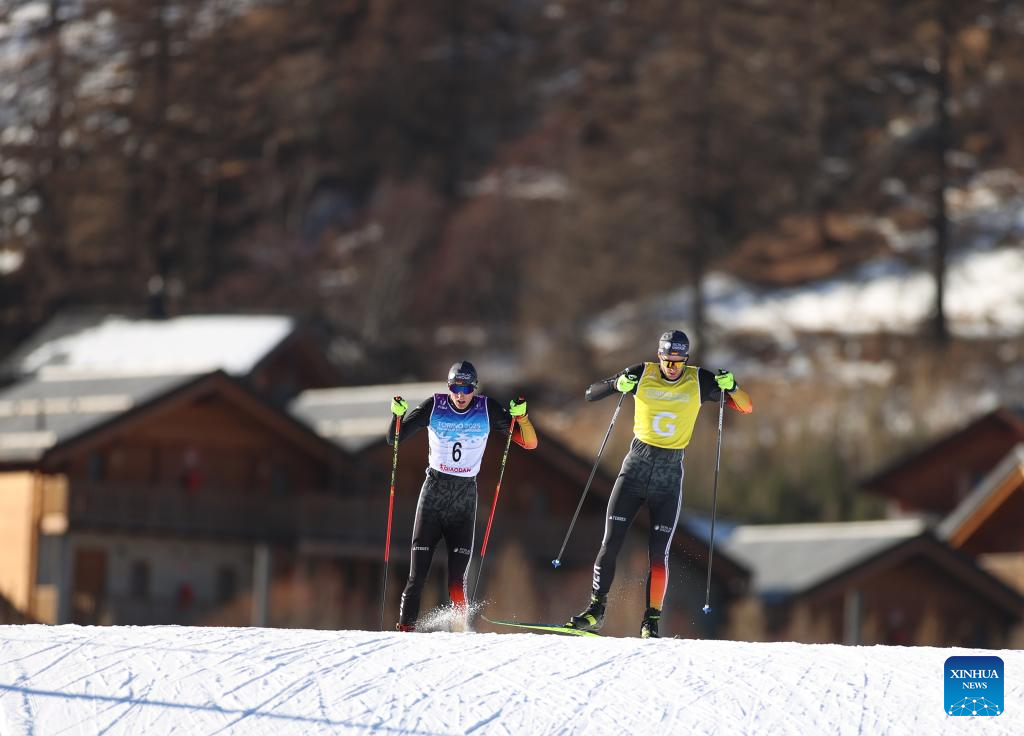 Lennart Mattis Volkert (L) of Germany competes during NS class of the Men's 10km Free final of para cross country event at the Torino 2025 FISU World University Winter Games in Pragelato, Italy, Jan. 15, 2025. (Xinhua/Li Jing)