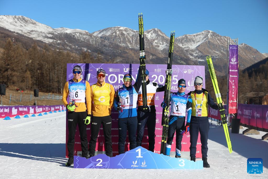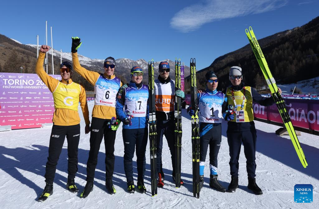 Gold medlaist Inkki Inola (3rd L) of Finland, silver medalist Lennart Mattis Volkert (2nd L) of Germany and bronze medalist Roman Kurbanov (2nd R) of Kazakhstan pose for photos after the awarding ceremony for NS class of the Men's 10km Free final of para cross country event at the Torino 2025 FISU World University Winter Games in Pragelato, Italy, Jan. 15, 2025. (Xinhua/Li Jing)