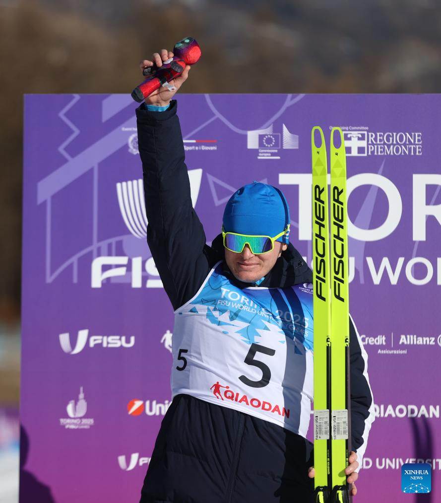 Silver medalist Denis Zinov of Kazakhstan poses for photos during the awarding ceremony for LW class of the Men's 10km Free final of para cross country event at the Torino 2025 FISU World University Winter Games in Pragelato, Italy, Jan. 15, 2025. (Xinhua/Li Jing)